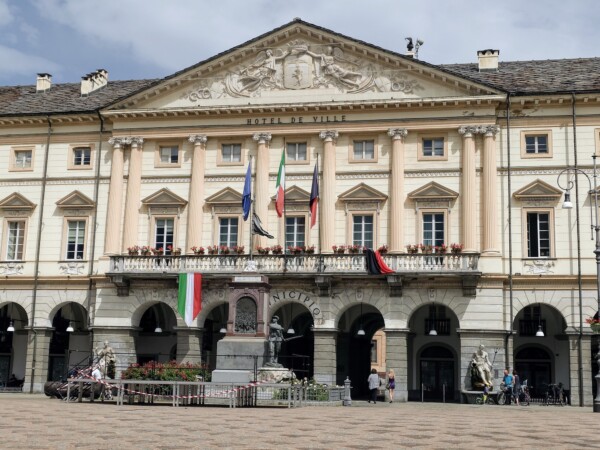 Richtig monumental erscheint das Rathaus von Aosta. Das im neoklassischen Stil erbaute Hôtel de Ville liegt am Hauptplatz der Stadt. Die beiden Statuen auf dem Dach verkörpern die beiden Flüsse Dora Baltea und Buthier, welche durch Aosta fliessen.