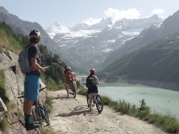 Beim E-Bike-Ausflug sind dann wieder alle dabei. Mit Guide Mattia starten wir unsere Tour entlang des grössten künstlichen Stausees des Aostatals. Der imposante Staudamm gehört zu den grössten Europas und ist der Ausgangspunkt.