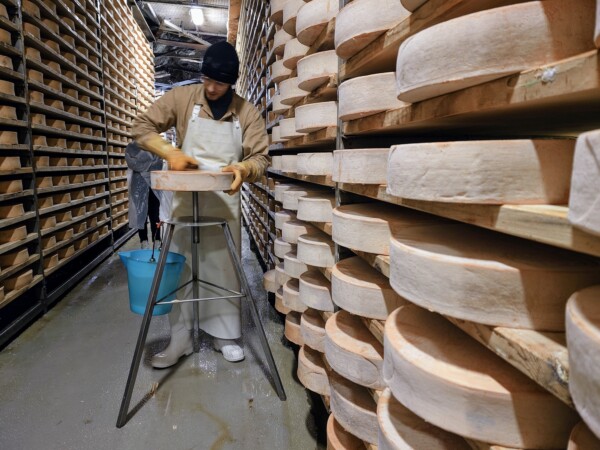 Handarbeit im Reifungskeller der Fontina DOP Käse in Valpelline.