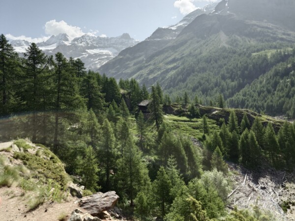 Das letzte Stück geht es nur noch geradeaus. Am Ende des Sees auf der Alp Prarayer liegt die Berghütte, wo wir zum Mittagessen erwartet werden. Im Hintergrund der sattgrünen Landschaft glitzern die schneebedeckten Gipfel der Walliser Alpen. Zum Beispiel den Dent d’Hérens und das Matterhorn.