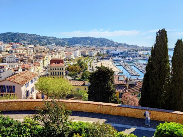 Durch die schmalen Altstadtgassen spazieren wir bis zum Hafen. Manche Häuserfassade hat schon bessere Zeiten gesehen. Hier sind die Preise in den Restaurants noch moderat. Schon am Hafen wird’s dann teurer. Lohnen tut sich auf jeden Fall ein Blick zurück auf den Hügel. Danach machen wir uns auf den Weg an die Croisette.