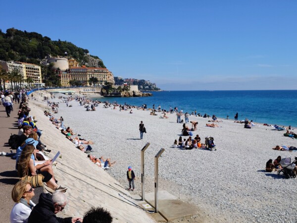 Die am Meeresufer liegende Promenade ist wie ein Magnet. Menschen flanieren gemütlich der Küste entlang und geniessen den Blick aufs Mittelmeer. Viele machen es sich auf dem breiten Kiesstrand möglichst bequem und ein paar wagen sich sogar ins Wasser. Das präsentiert sich in den schönsten Blautönen, die der Küste auch ihren Namen gaben: La Côte d’Azur.