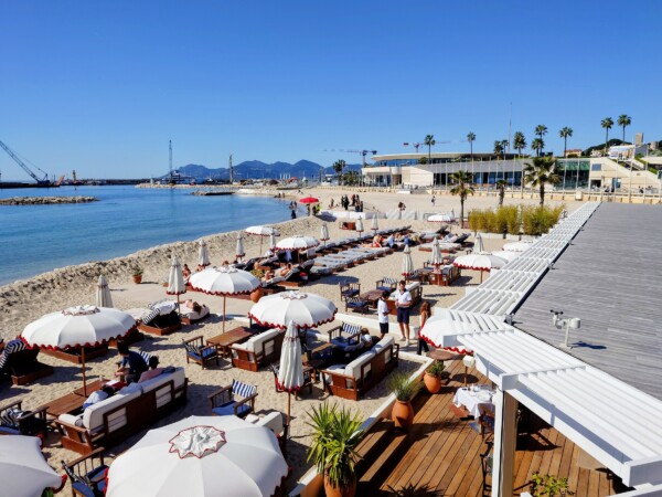 Beach-Club an der Croisette und das Palais des Festivals von Cannes.