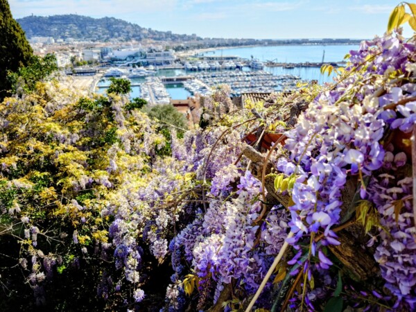 Um uns am nächsten Tag einen Überblick über Cannes zu verschaffen, müssen wir den Hügel mit dem alten Kastell zu Fuss erklimmen. Die Anstrengung lohnt sich! Zwischen blühenden Frühlingsblumen hindurch sind die Hotelpaläste an der Croisette und der Hafen zu sehen.