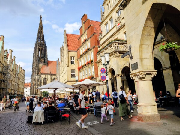 Keine Standesunterschiede gibt es auf dem Platz vor dem St.-Paulus-Dom. Jeden Mittwoch und Samstag findet hier der Wochenmarkt statt. Ungewöhnlich ist die Westfront des im romanischen Stil erbauten Kirchengebäudes. Es ist eine einfache Sandsteinwand mit 16 kreisrunden Fenstern. Die Einheimischen nennen sie die «Wählscheibe zum Himmelstelefon» oder «Heilig-Geist-Brause».