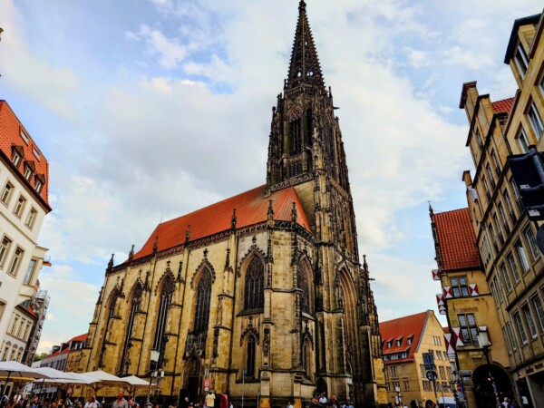 Auch die St. Lamberti Kirche litt unter den Bombardierungen. Besonders auffallend ist der «Lambertiturm» mit einer Höhe von 90,5 Metern und der neogotischen Form. Nachts leuchtet an seiner Spitze eine Himmelsleiter und dank der «Irrlichter» sind die eisernen Körbe der 1536 hingerichteten Täufer zu sehen.